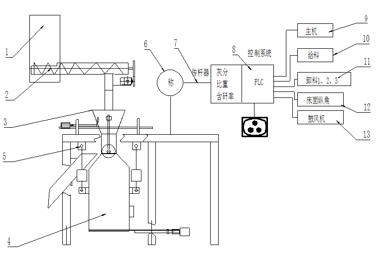 溜槽内的物料用螺旋取样机取产品样,产品样到缓冲仓,而后进入密度测定仪容器,容器吊挂在电子秤架上,载重的容器在电子秤上显示重量。重量传感器将得出比重换算出灰分或含矸率,到PLC控制系统,根据灰分或含矸率的数据PLC控制系统调节给料量、供风量、卸料量、主机振动频率、床面纵角调节装置等,使整机运行平稳、提高分选效果